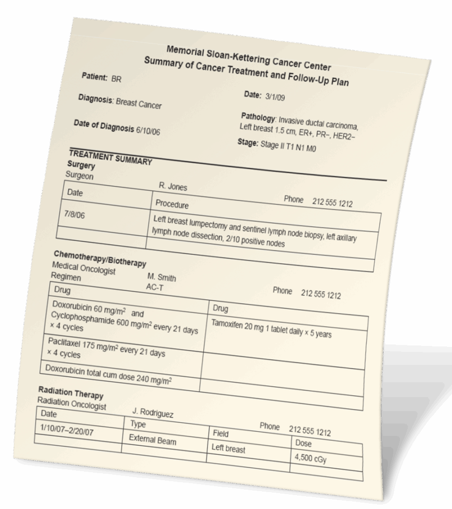 Future care plan — summary of next steps in your treatment plan. This might include conversation around surveillance appointments, screening for primary and secondary cancers, lifestyle changes, vaccinations, diet changes, exercise, specialists, sexual health, physical therapy and more